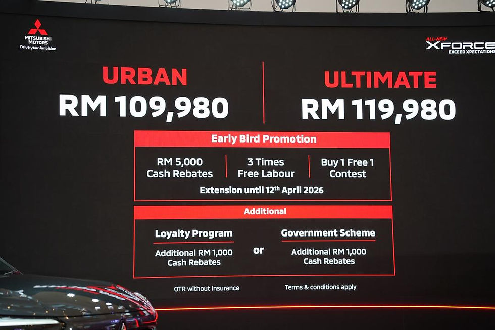 Sejak tempahan dibuka pada 5 Februari, Mitsubishi Xforce serba baharu telah menerima sambutan yang sangat menggalakkan daripada pelanggan Malaysia, dengan sebanyak 2,600 tempahan direkodkan setakat ini, mencerminkan permintaan yang semakin meningkat terhadap SUV kompak yang mengimbangi reka bentuk, fungsi dan kegunaan harian. Mitsubishi Motors Malaysia turut mengesahkan bahawa kesemua 2,600 pelanggan yang telah membuat tempahan layak menerima promosi Early Bird, termasuk rebat tunai RM5,000, tiga kali servis upah percuma—menjadikan jumlah kos penyelenggaraan selama 5 tahun hanya RM3,900—serta peluang menyertai peraduan “Buy 1 Free 1” Xforce.